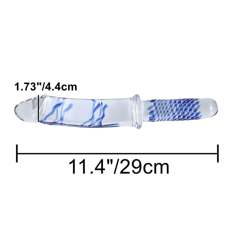 This 11.4 Inch Large Blue Swirl Glass Dildo is designed for those who prefer deeper stimulation and a bold presence. With a total length of 11.4 inches and a widest diameter of 1.73 inches, this Large Crystal Glass Dildo offers confident control and enhanced sensation. -