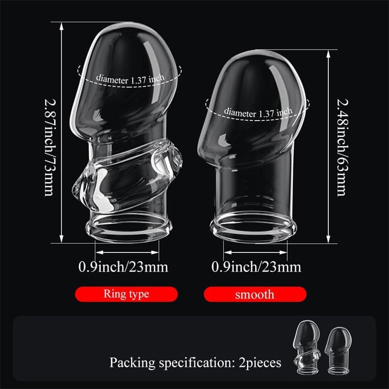 The shorter penis enlargement sleeve focuses on thickening and enhancing the glans, while the longer sleeve features raised nodules to deliver added stimulation for G-spot pleasure during partner play.