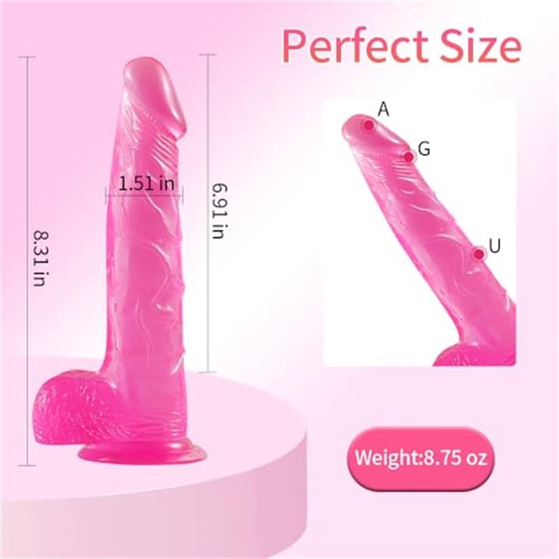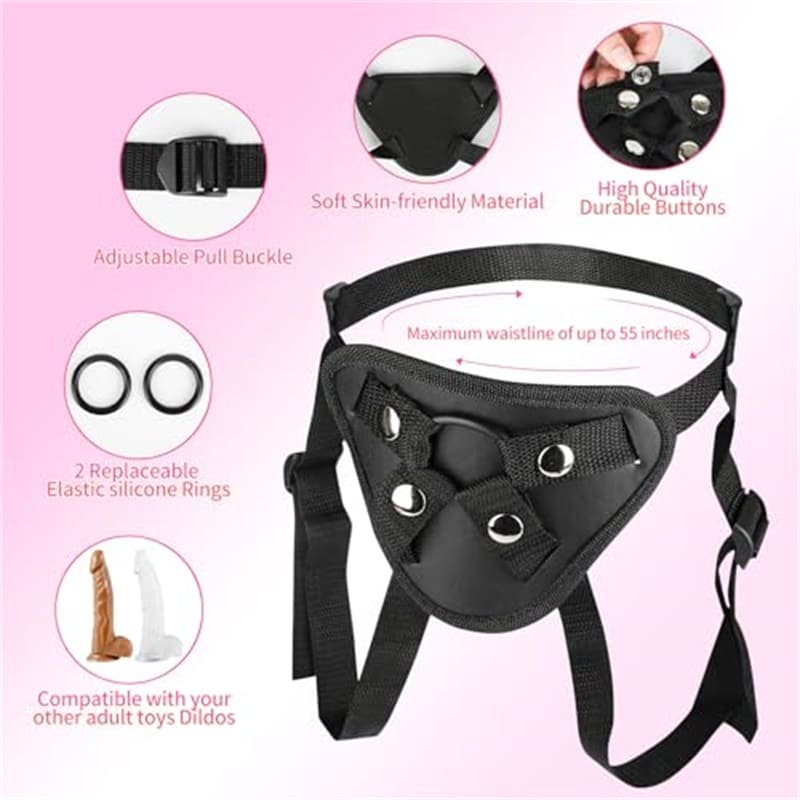 This strap on dildo set includes an 8.31-inch pink dildo with a 6.9-inch insertable length. The G-spot dildo can be used with the harness, attached via suction cup, or used independently, offering flexible options for couples or solo use.