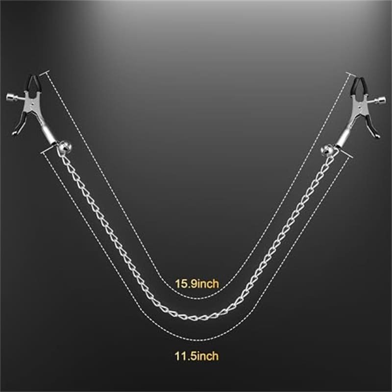 A 23.62-inch detachable metal chain connects both clamps, allowing flexible adjustment of length. This feature enhances versatility, making these nipple clips for couples adaptable for different BDSM bondage toys setups.