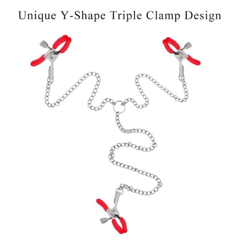 This bold BDSM Adjustable Breast Nipple Clamps 3 Head Nipple Clips feature a unique Y-shape triple clamp structure with adjustable knob control. Designed for visual impact and functionality, this metal nipple clamp chain for couples delivers balanced tension and standout styling.