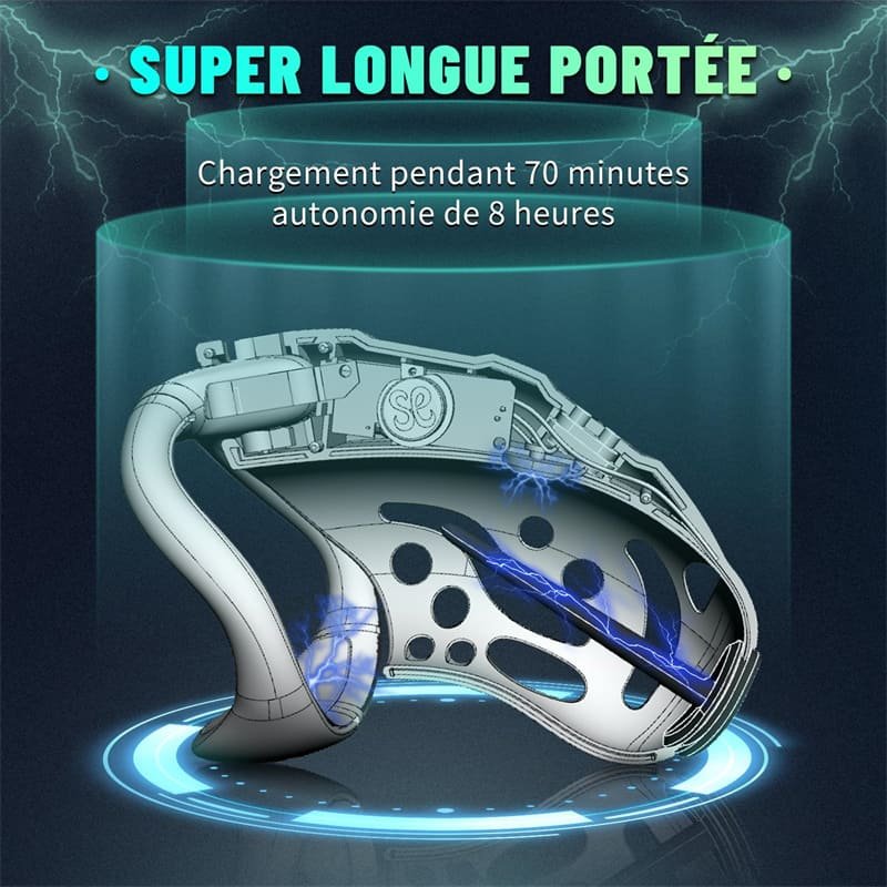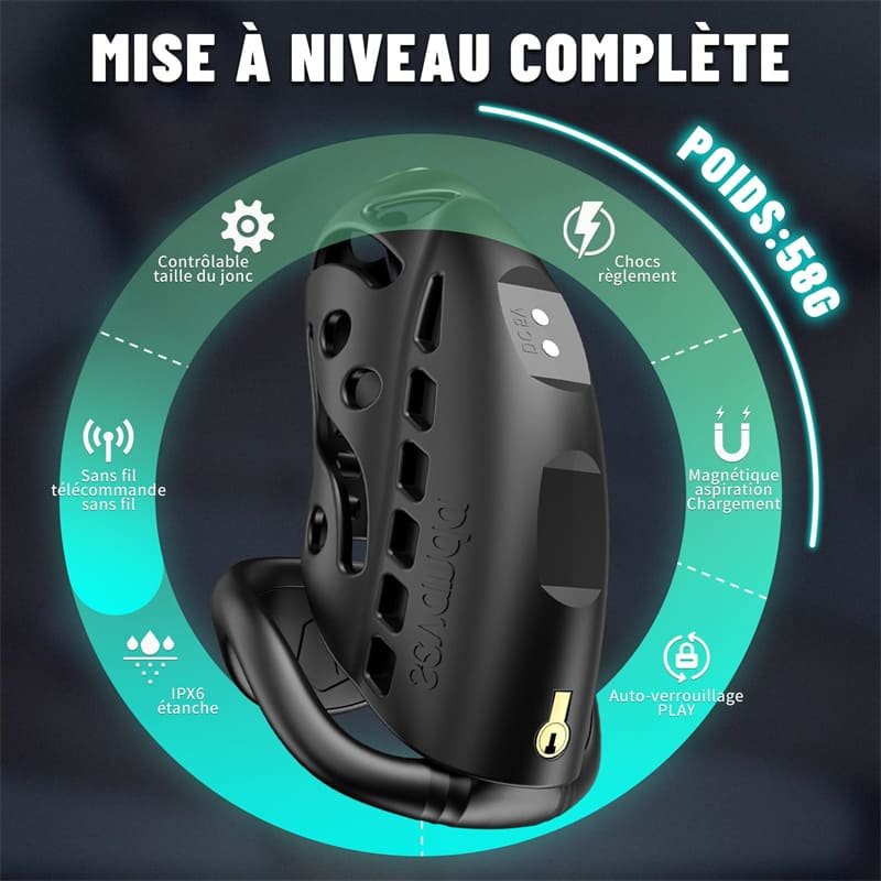 This chastity device for men includes a removable electric urethral plug, allowing flexible use depending on preference. The plug can be replaced with a silicone pad module, offering two distinct experiences within one male chastity lock system.