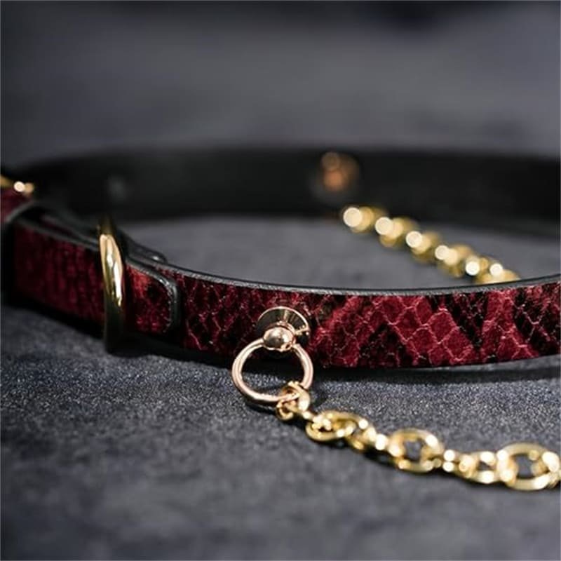 【Red Snakeskin Leather Choker Necklace with Gold Chain】