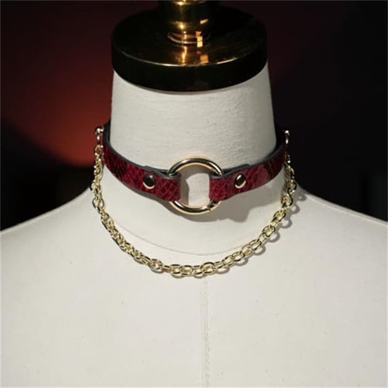 Make a bold statement with this eye-catching Red Snakeskin Leather Choker Necklace with Gold Chain – Gothic Punk Adjustable Women’s Collar. The vivid snakeskin texture paired with a gold-tone chain creates a striking contrast that enhances gothic and punk-inspired outfits.