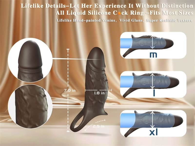 This Vibrating Penis Sleeve Cock Ring is designed for couples seeking enhanced intimacy. Made from All Liquid Silicone Penis Sleeve, the stretchable ring adjusts comfortably to most sizes while the front sleeve extends length by 2.6 inches, delivering deeper connection and confident performance. -